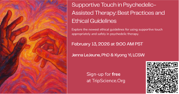 In this free webinar, scheduled for February 13 at 9:00 a.m. Pacific Time, the presenters will review emerging recommendations on when and how touch may be incorporated in psychedelic contexts, including suggested protocols, best practices, and current regulations within state-regulated psychedelic programs. They will also discuss how to engage clients in transparent, values-based conversations about touch, as well as the significant ethical considerations that arise when individuals are in non-ordinary states of consciousness.